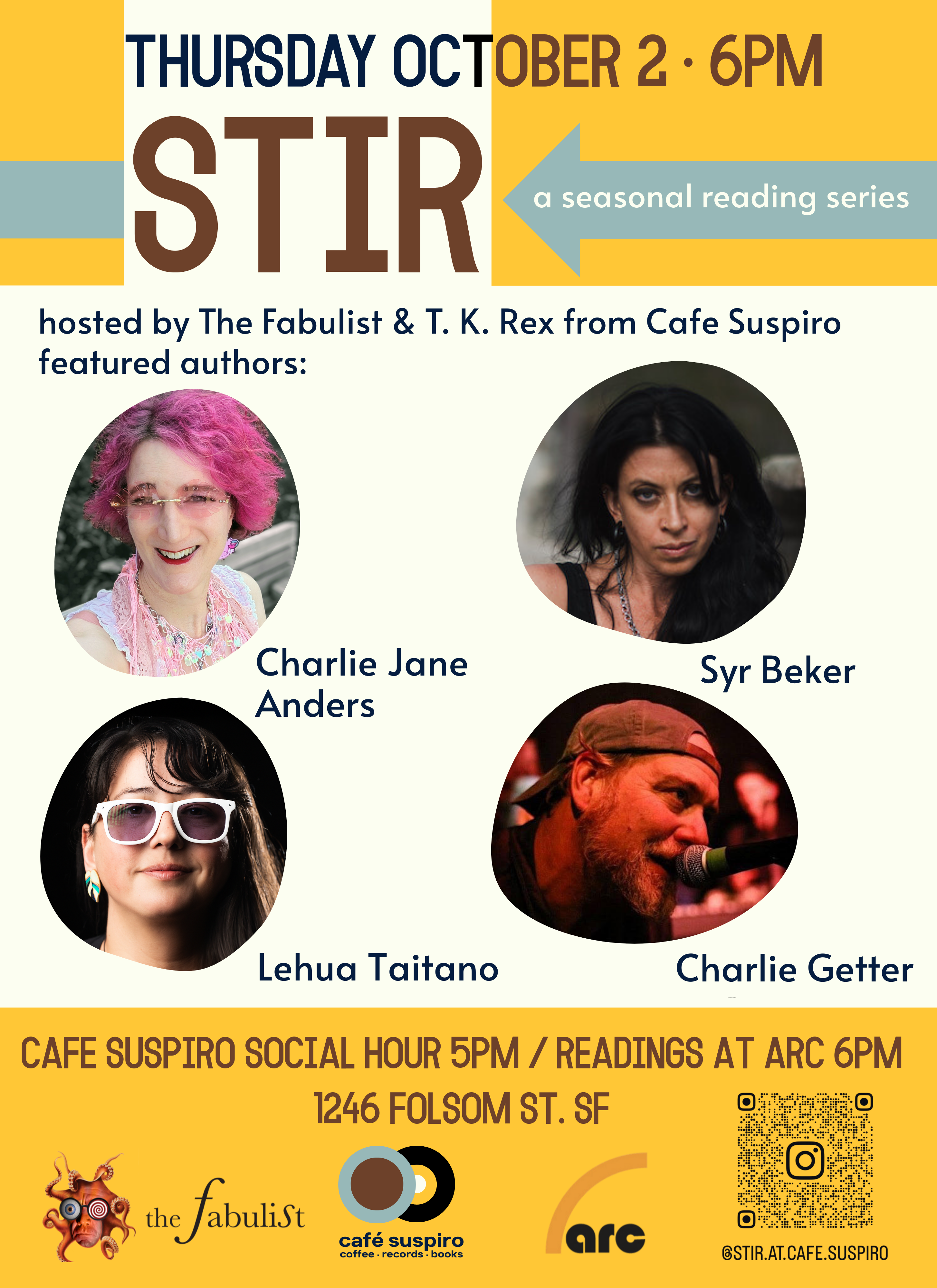 On October 2, stop by Cafe Suspiro from 5-6 p.m. for coffee and vibes, and then join the hosts and four local authors at Arc Gallery next door from 6pm to 8pm for an evening of local literary adventure in the thriving SoMa West/Folsom Corridor neighborhood — a longtime home to after-hours art, literary happenings, music and performance. STIR now joins SoMa Nights, new cafes and restaurants, and a resurgent arts and nightlife scene as part of SoMa West's post-pandemic flowering.